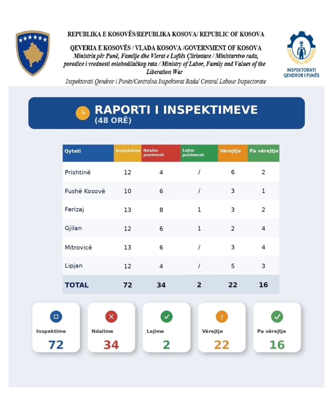 Gjatë 48 orëve të fundit janë realizuar gjithsej 72 inspektime, nga të cilat janë shqiptuar 34 ndalime të punimeve, 2 leje për punim, si dhe janë evidentuar 22 vërejtje dhe 16 raste pa vërejtje.