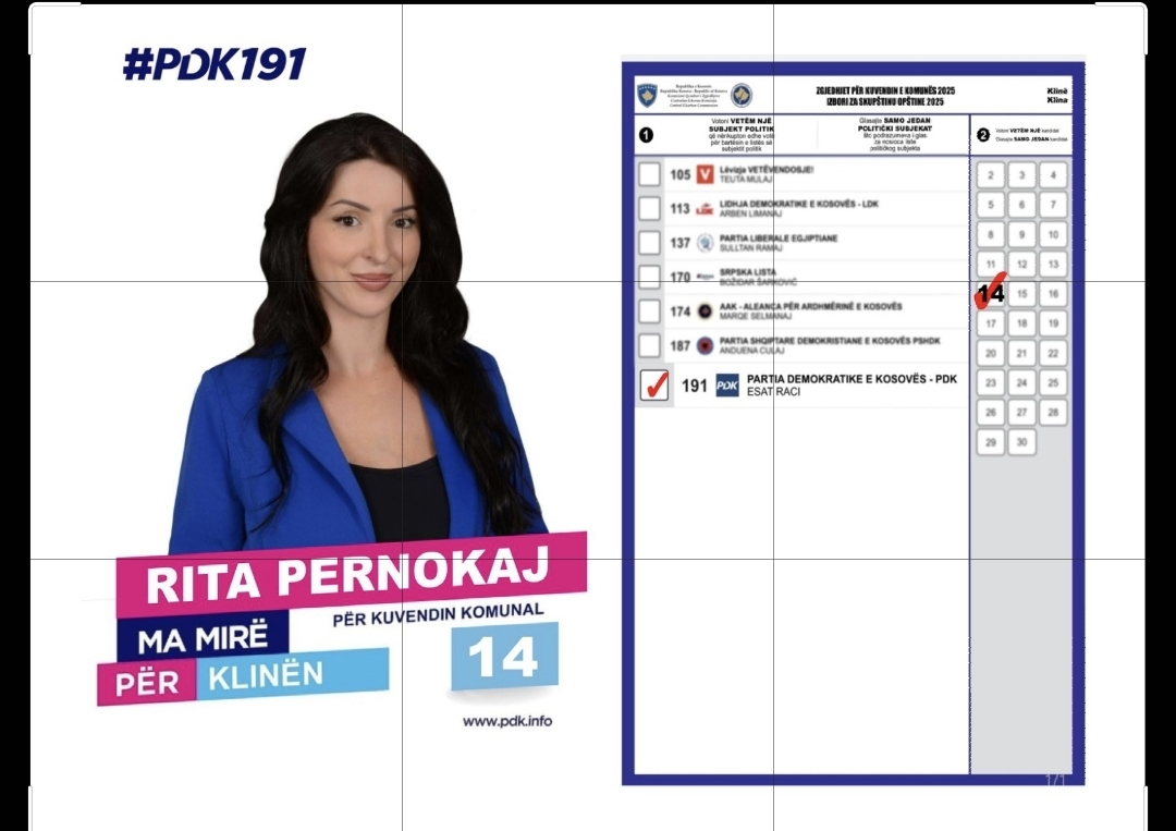 Rita Bibaj Pernokaj kandidatja për asambliste në Kuvendin Komunal të Klinës, në kuadër të listës së Partisë Demokratike të Kosovës (PDK), synon të sigurojë një ulëse pas zgjedhjeve të 12 terorit.