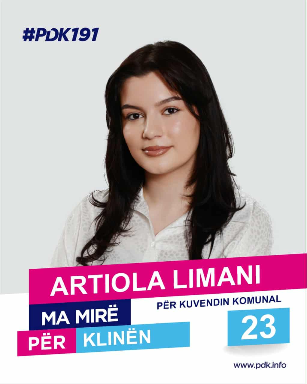 Artiola Limani është kandidate për asambliste në kuadër të Partisë Demokratike të Kosovës (PDK), duke mbajtur numrin 23 në fletëvotim dhe numrin 191 në listë.