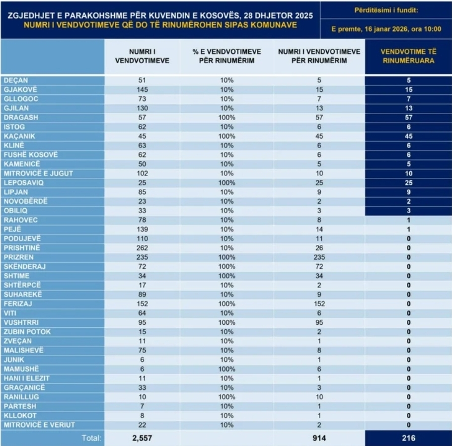 “Nga fillimi i këtij procesi (e martë, 13 janar 2026, ora 18:00) dhe deri më tani (e premte, 16 janar 2026, ora 10:00) janë rinumëruar 216 nga 914 vendvotime, të cilat u takojnë komunave: Deçan (5/5), Gjakovë (15/15), Gllogoc (7/7), Gjilan (13/13), Dragash (57/57), Istog (6/6), Kaçanik (45/45), Klinë (6/6), Fushë Kosovë (6/6), Kamenicë (5/5), Mitrovicë e Jugut (10/10), Leposaviq (25/25), Lipjan (9/9), Novobërdë (2/2), Obiliq (3/3), Rahovec (1/8) dhe Pejë (1/14)”, ka thënë ai.