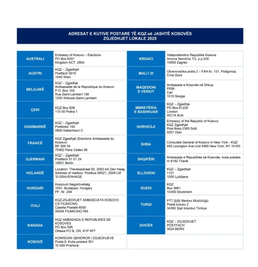 Me qëllim të ofrimit të mundësisë për votim për shtetasit që janë regjistruar për të votuar përmes postës, kutitë postare janë funksionale në këto shtete: Australi, Austri, Belgjikë, Çeki, Danimarkë, Francë, Gjermani, Holandë, Hungari, Itali, Kanada, Kosovë, Kroaci, Mali i Zi, Maqedonia e Veriut, Mbretëria e Bashkuar, Norvegji, ShBA, Shqipëri, Slloveni, Suedi, Turqi dhe Zvicër.