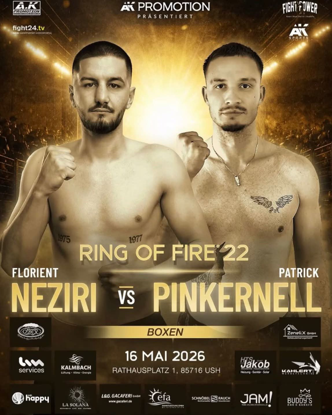 Neziri, i cili njihet edhe si kampion në kickboks, do të jetë pjesë e eventit të madh të boksit “Ring of Fire 22”, ku do të përballet me kundërshtarin Patrick Pinkernell. Ndeshja do të zhvillohet më 16 maj në Rathausplatz 1, në Gjermani.