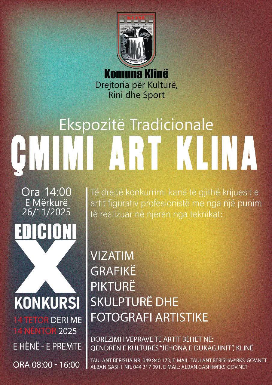 Ftojmë artistë.krijues figurativ të marrin pjesë në Ekspozitën tradicionale ART KLINA 2025 më nga një krijim në :vizatim,pikturë,skulpturë,Grafikë e fotografi artistike.