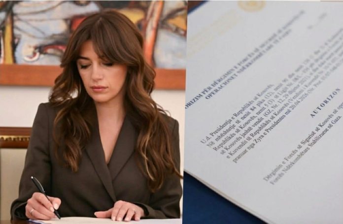 Presidentja në detyrë, Albulena Haxhiu sot ka autorizuar dërgimin e Forcës së Sigurisë së Kosovës në operacion ndërkombëtar paqeruajtës, si pjesë e Forcës Ndërkombëtare Stabilizuese në Gaza.