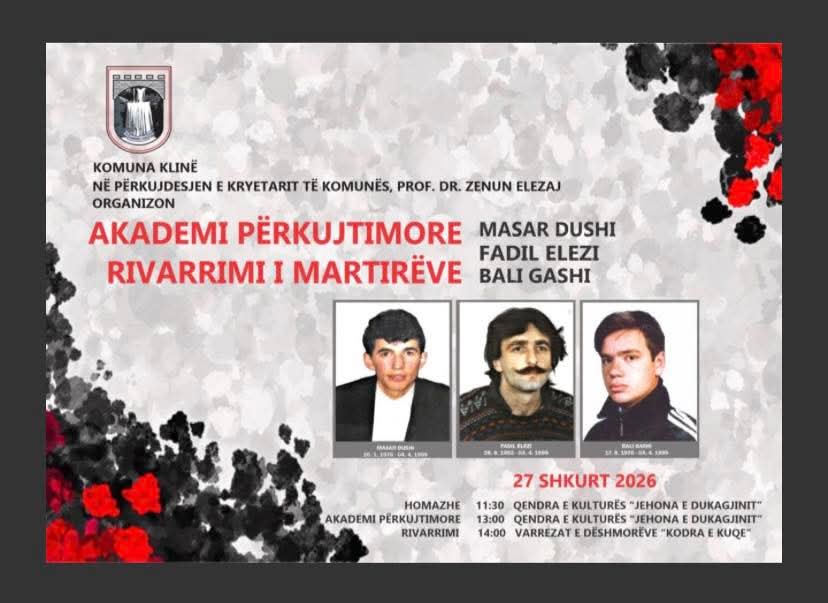 Nesër (e premte, 27 shkurt) Komuna e Klinës organizon akademi përkujtimore dhe ceremoninë e rivarrimit të martirëve Masar Dushi, Fadil Elezi dhe Bali Gashi, shkruan Klina info.