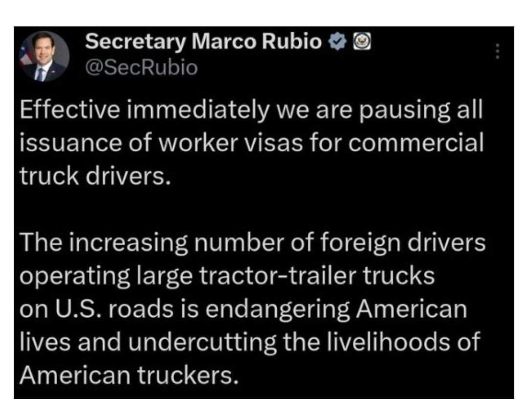 Ndryshe, SHBA-ja ndaloi lëshimin e vizave të punës për shoferët e huaj të kamionëve, njofton sekretari amerikan i Shtetit, Marco Rubio.