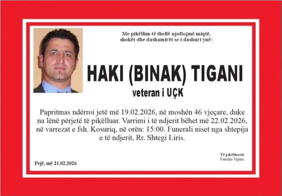 Varrimi i të ndjerit do të bëhet më 22 shkurt 2026 në varrezat e fshatit Kosuriq në orën 15:00, pas ceremonisë që fillon nga shtëpia e familjes.
