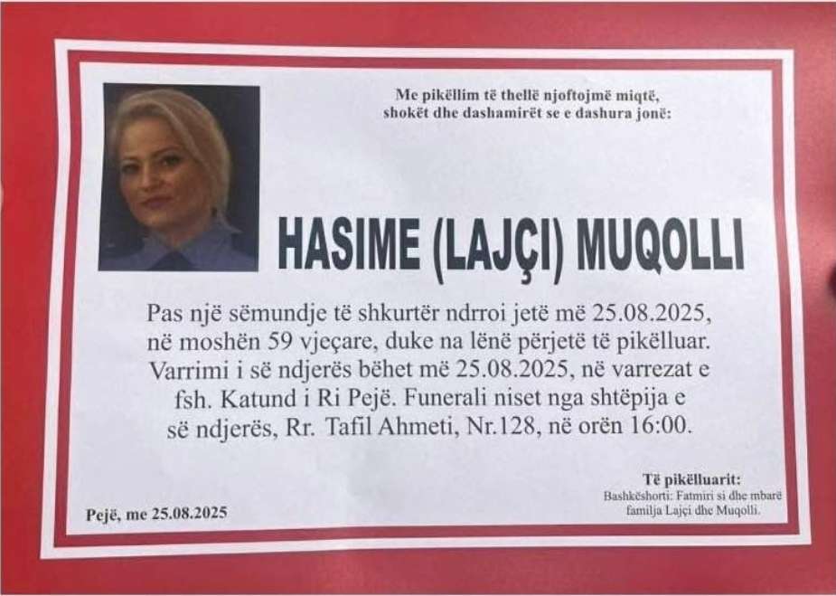 Uncategorized Ndërron jetë zyrtarja policore, në moshën 59 vjeçare 25/08/2025 Share on Facebook Tweet on Twitter Ka ndërruar jetë pjesëtarja e policisë së Kosovës, Hasime Muqolli. 59- vjeçarja ka ndërruar jetë pas një sëmundje të shkurtër, Varrimi it ë ndjerës bëhet sot, në varrezat e fshatit Katund i ri- Pejë.