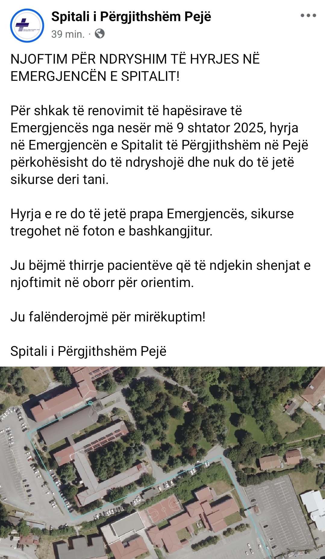 Sipas njoftimit nga Spitali i Përgjithshëm në Pejë, hyrja e deritanishme do të mbyllet përkohësisht, ndërsa pacientët dhe vizitorët do të duhet të përdorin hyrjen e re, e cila ndodhet në pjesën e pasme të objektit të Emergjencës.