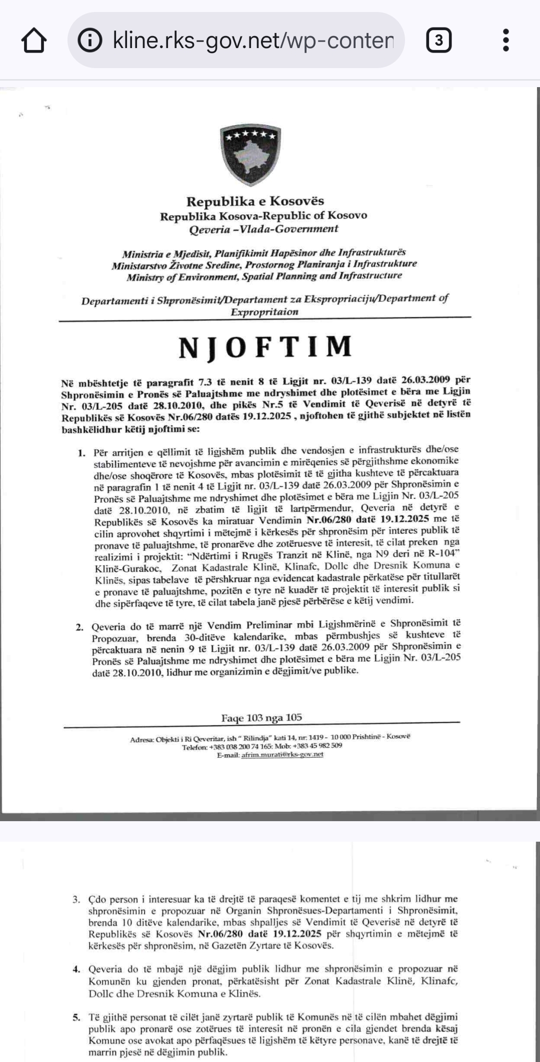 Njoftim për shpronësim në interes publik për ndërtimin e Rrugës Transit në Klinë
