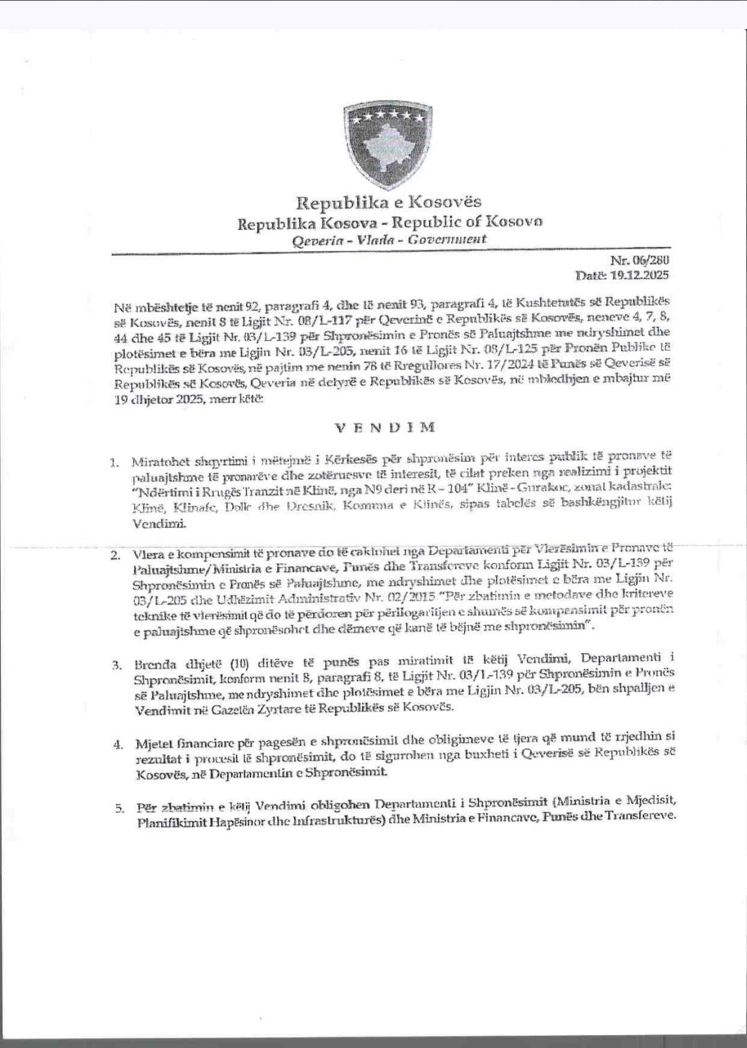 Qeveria e Kosovës ka shpallur njoftim për shpronësim në interes publik për realizimin e projektit “Ndërtimi i Rrugës Transit në Klinë”, që përfshin zonat kadastrale Klinë, Klinavc, Dollc dhe Dresnik.