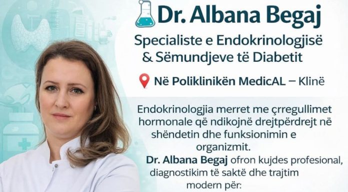 🩺 𝐃𝐫. 𝐀𝐥𝐛𝐚𝐧𝐚 𝐁𝐞𝐠𝐚𝐣 Specialiste e Endokrinologjisë dhe Sëmundjeve të Diabetit 📍 Në Poliklinikën MedicAL – Klinë Diagnostikim dhe trajtim për: Diabetin Tip 1 dhe Tip 2 Çrregullime të gjëndrës tiroide Çrregullime të gjëndrave mbiveshkore Sëmundjet e hipofizës Çrregullime hormonale te gratë dhe burrat Sindroma Polikistike e Ovareve (PCOS) Probleme me metabolizmin e kalciumit dhe vitaminës D (osteoporoza, hipoparatiroidizmi, etj.) 📆 Çdo të Premte, nga ora...