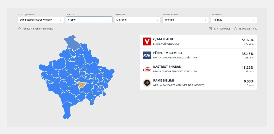 Komisioni Qendror i Zgjedhjeve ka përfunduar numërimin e votave të diasporës për komunën e Shtimes.Fitues me votat e disaporës ka dalë kandidati i Vetëvendosje, Qamajl Aliu, me 51.63%, duke lënë pas kandidatin e PDK-së, Përparim Musa me 35.15% të votave.I treti renditet Kastriot Shabani i LDK-së me 13.22% të votave.Kurse kandidati i AAK-së, Ramë Bislimi, nuk ka marrë asnjë votë.