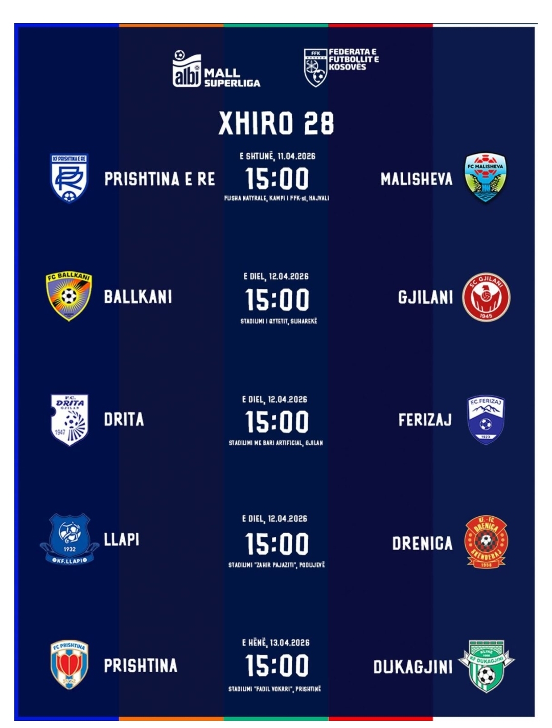 Federata e Futbollit të Kosovës ka publikuar orarin për këtë xhiro, shkruan IndeksOnline.