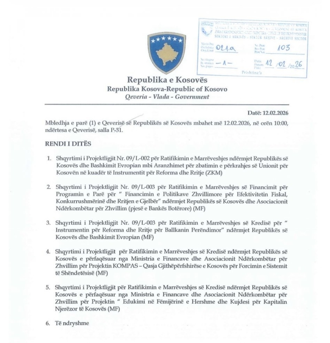 Po ashtu, kabineti qeveritar do të shqyrtojë marrëveshjen e kredisë për Instrumentin për Reforma dhe Rritje për Ballkanin Perëndimor ndërmjet Kosovës dhe Bashkimit Evropian.