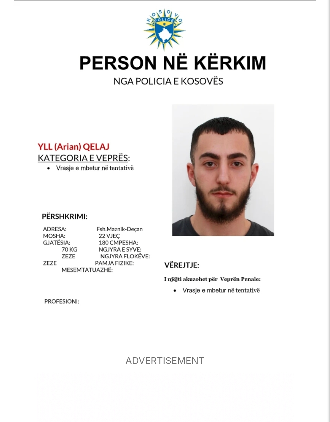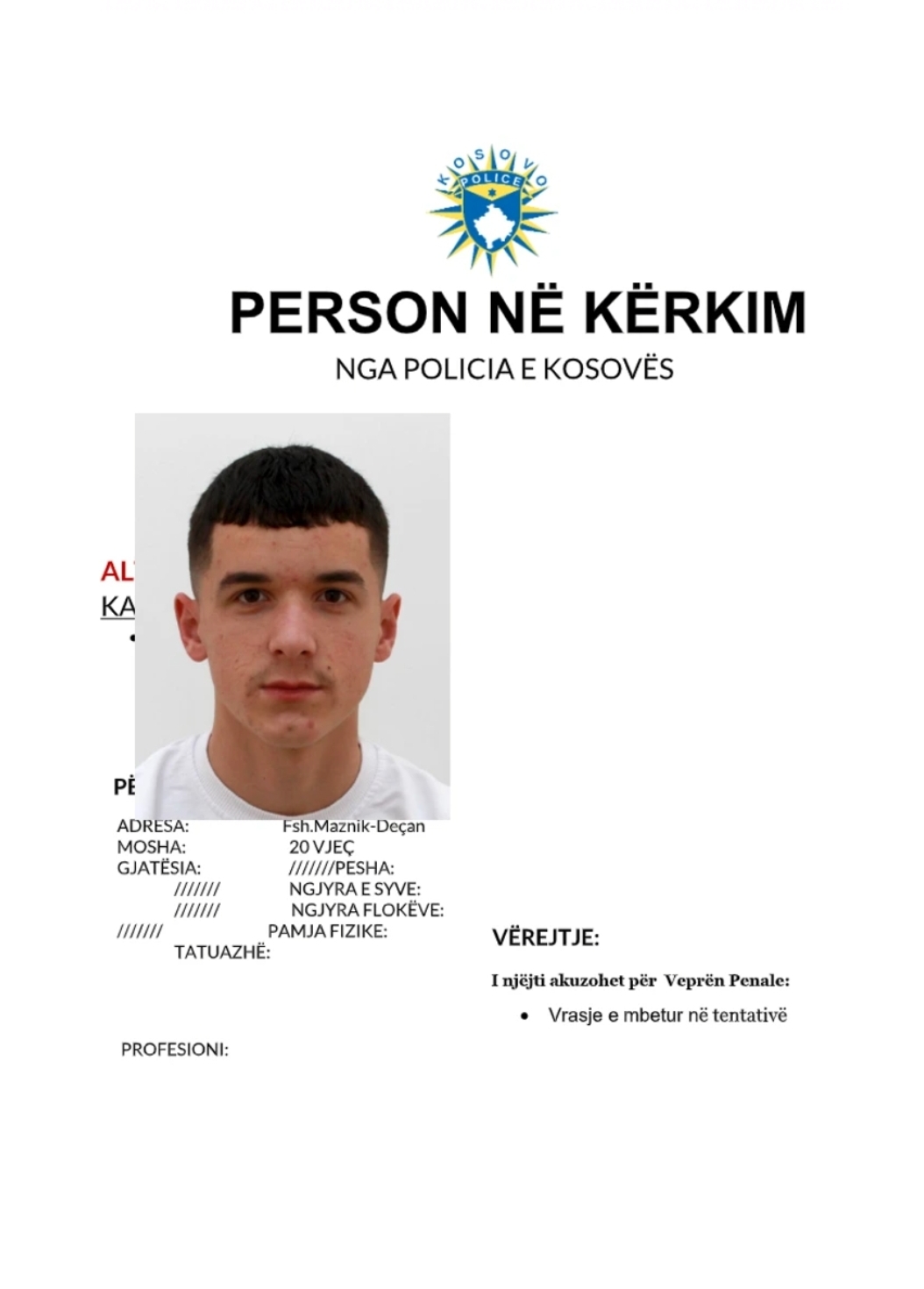 Tutje në njoftim thuhet se tё pandehurit kërkohen për veprën penale: Vrasje e mbetur në tentativë