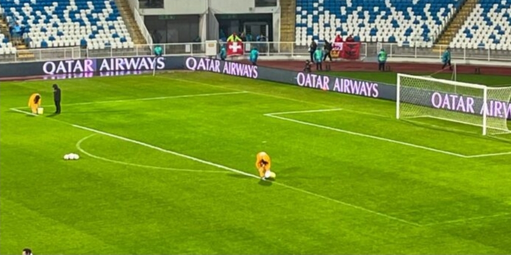 Vijat e bardha të fushës janë fshirë për shkak të shiut dhe janë duke u rilyer nga punonjës të stadiumit pak para fillimit të takimit, Kosovë-Zvicër.