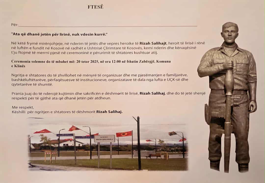 Në nderim të dëshmorit të lirisë Rizah Salihaj, më 20 tetor 2025, në ora 12:00, në fshatin Zabërgjë të Komunës së Klinës do të mbahet ceremonia solemne e përurimit të shtatores kushtuar atij, shkruan Klina info.