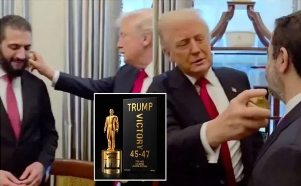 Trump shihet duke i dhuruar Al-Sharaa-s një shishe parfumi, duke e spërkatur mbi të dhe duke thënë: “Është aroma më e mirë… Dhe tjetra është për gruan tënde”.