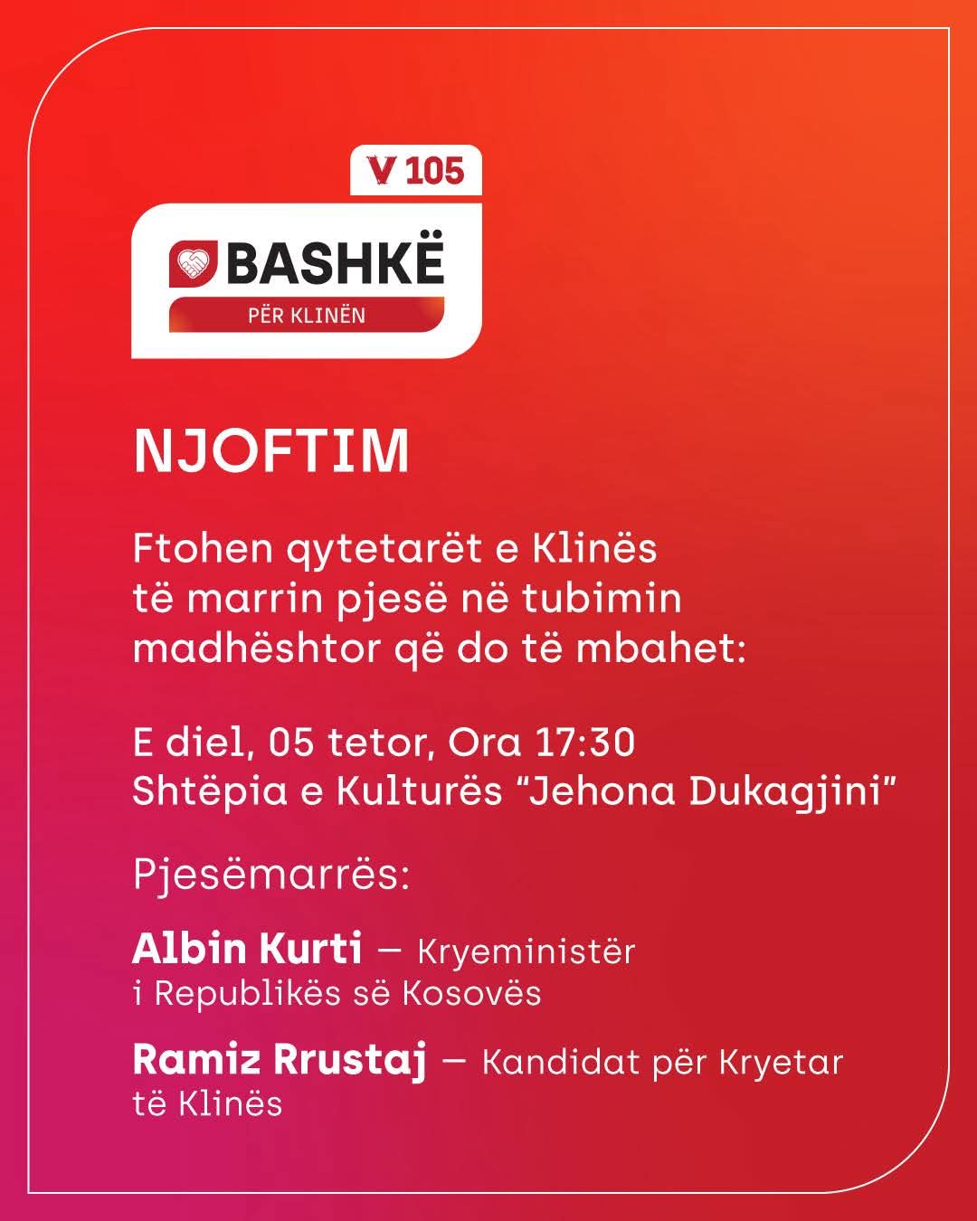 Në këtë ngjarje do të marrin pjesë Kryeministri i Kosovës, Albin Kurti, si dhe kandidati për kryetar të Komunës së Klinës, Ramiz Rrustaj.