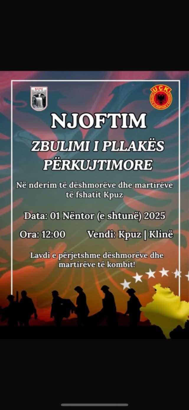 Në fshatin Kpuz të Komunës së Klinës do të mbahet ceremonia e zbulimit të pllakës përkujtimore kushtuar dëshmorëve dhe martirëve të kombit nga ky fshat.